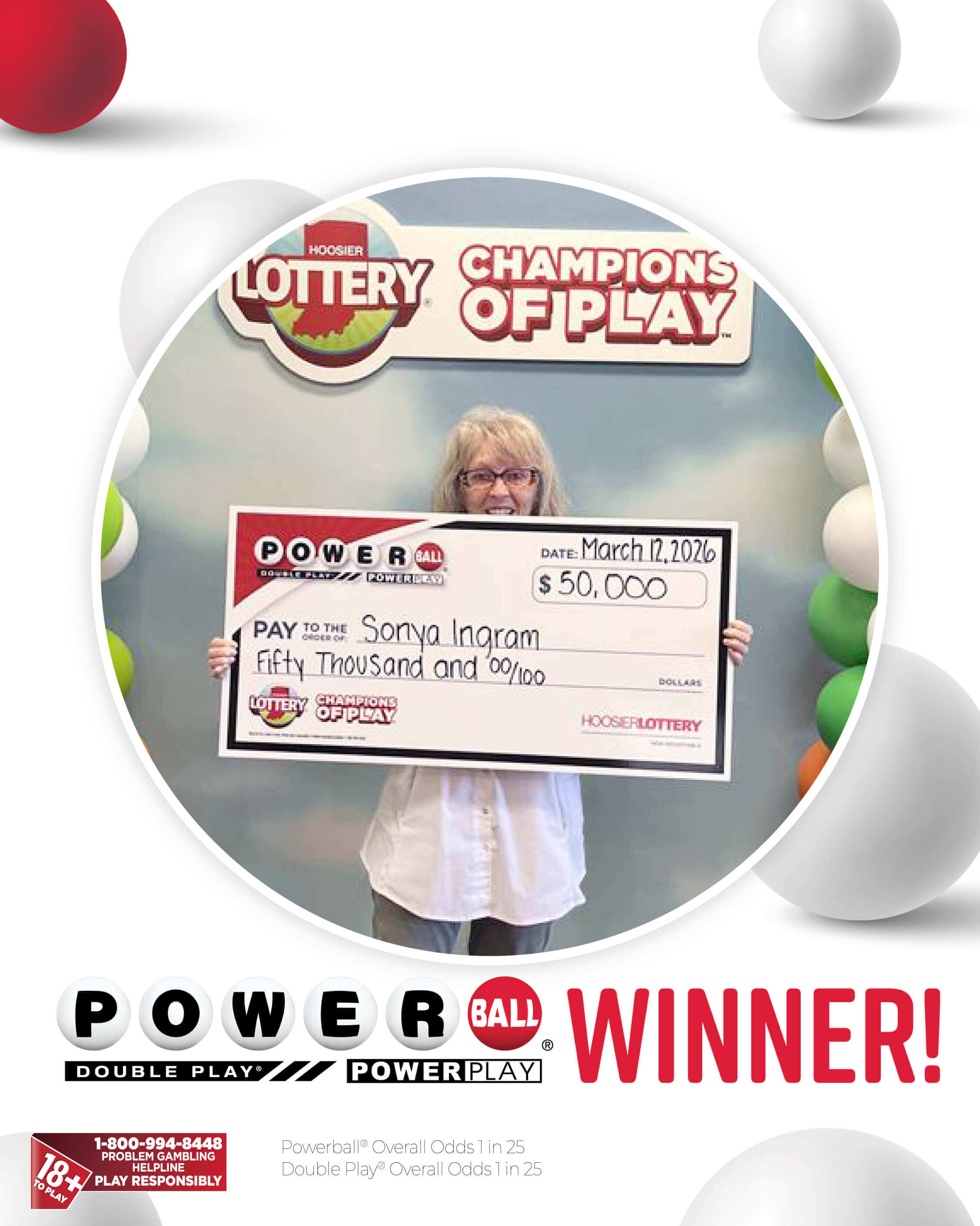 Sonya recently won a $50,000 Powerball® prize with a ticket she purchased at Quick Stop on 16th Street in Bedford, a retailer she says she regularly visits to buy her tickets.