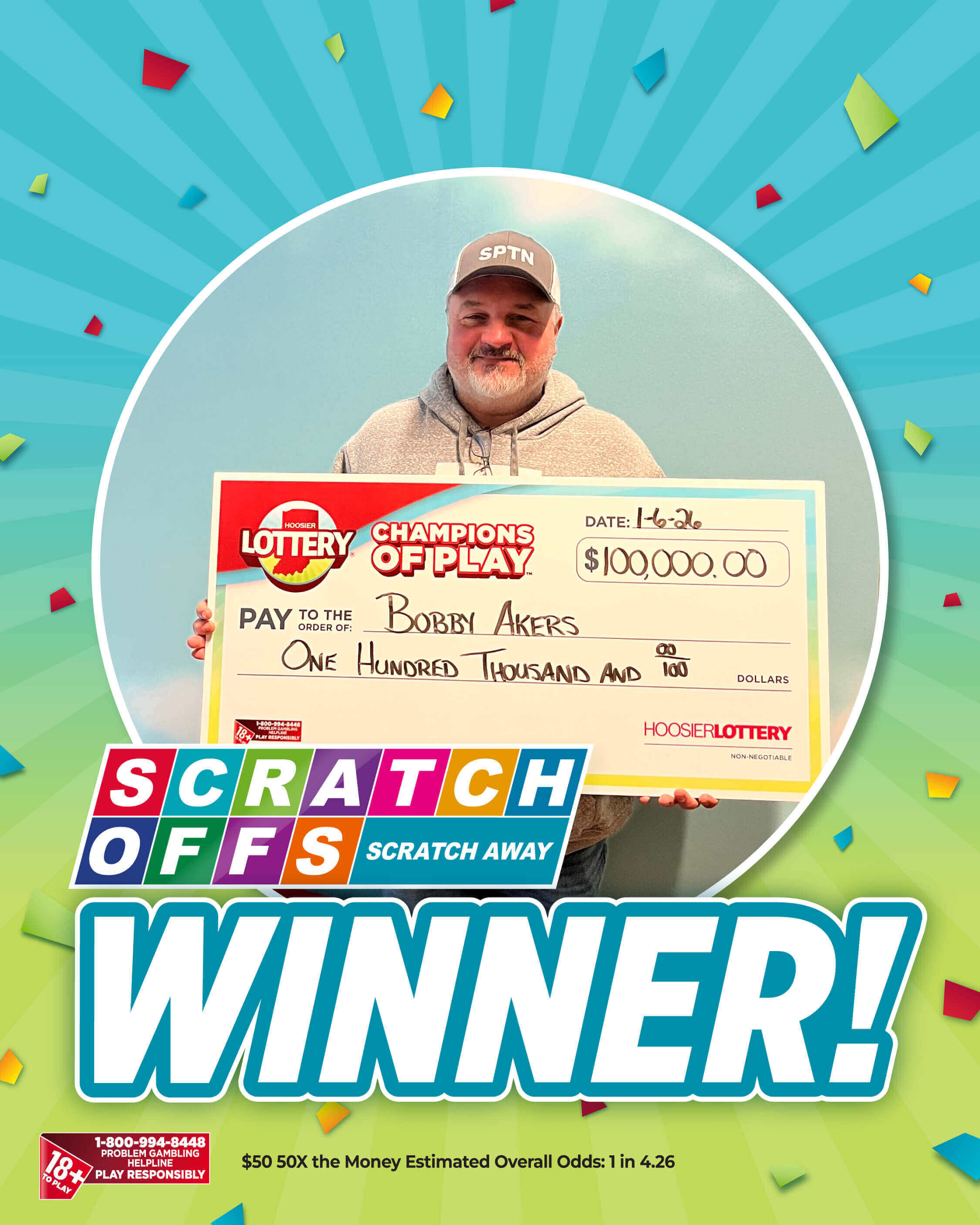 Bloomington resident Bobby Akers wanted to get his friend a particular brand of whiskey for Christmas, and after visiting several other stores, he finally found it at Kroger. On his way out of Kroger, he stopped at the Hoosier Lottery self-service machine and purchased two $50 50X the Money Scratch-offs.
