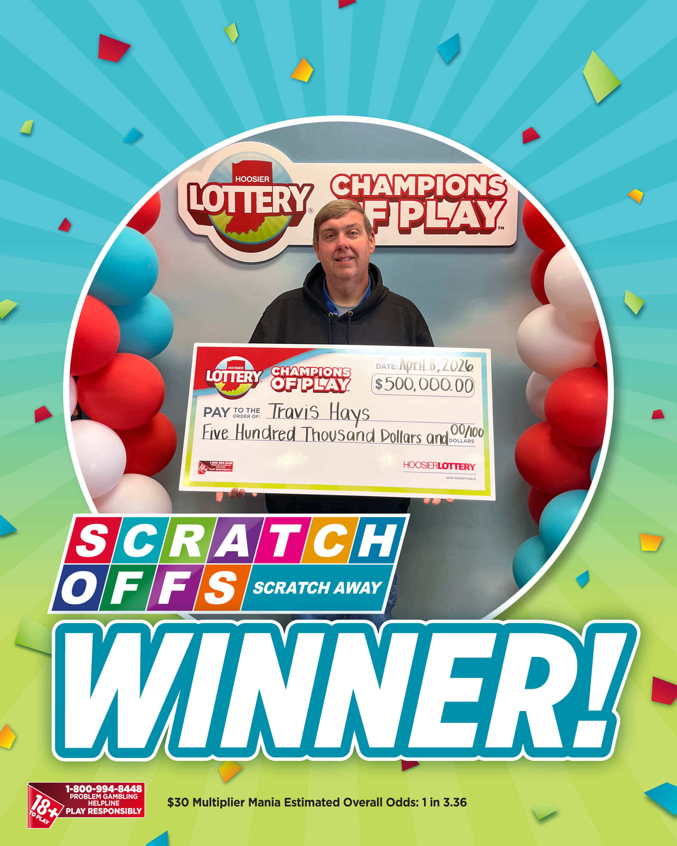 Travis Hays of Columbus recently claimed a $500,000 Top Prize after playing the Hoosier Lottery’s $30 Multiplier Mania Scratch-off.