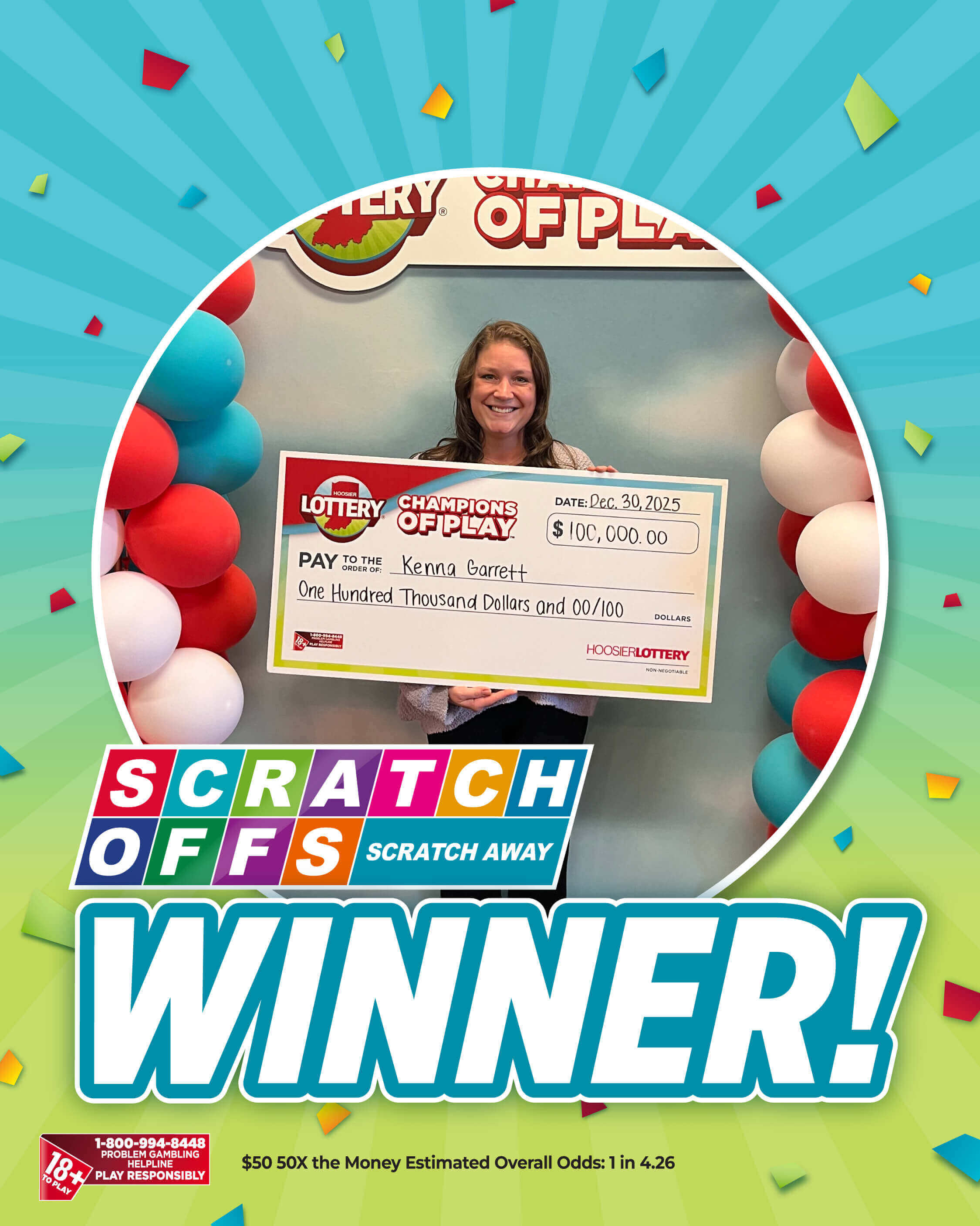 Kenna Garrett, an elementary school teacher, recently claimed a $100,000 top prize on a $50 50X the Money Scratch-off after taking a second look at her tickets.