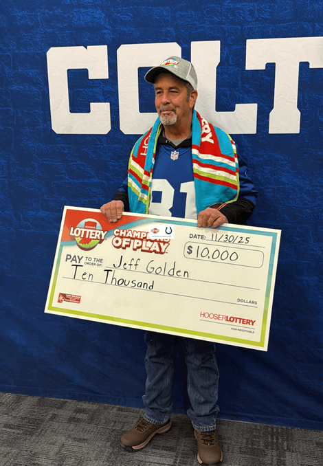 Golden entered the myLOTTERY Colts Game Changer Giveaway and was the grand prize winner out of more than 37,000 entries. In addition to the chance to win up to $250,000, Golden won 2026-27 Colts Club Season Tickets, four tickets to the Colts game on November 30, a $500 Hoosier Lottery prize pack, a $250 Indianapolis Colts Pro Shop gift card and a Tyler Warren autographed football.