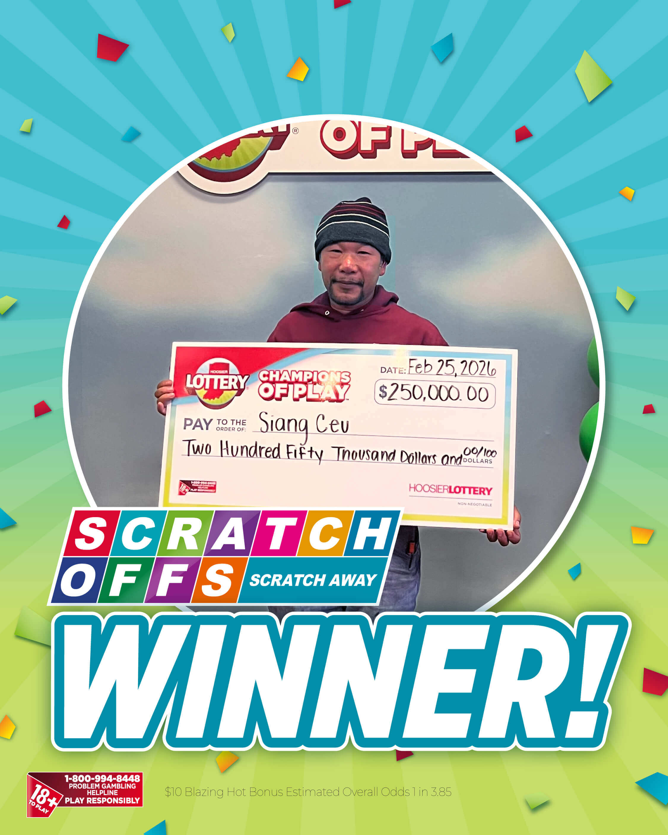 Greenwood resident Siang Ceu recently claimed a $250,000 Top Prize after playing the $10 Blazing Hot Bonus Scratch-off from the Hoosier Lottery.