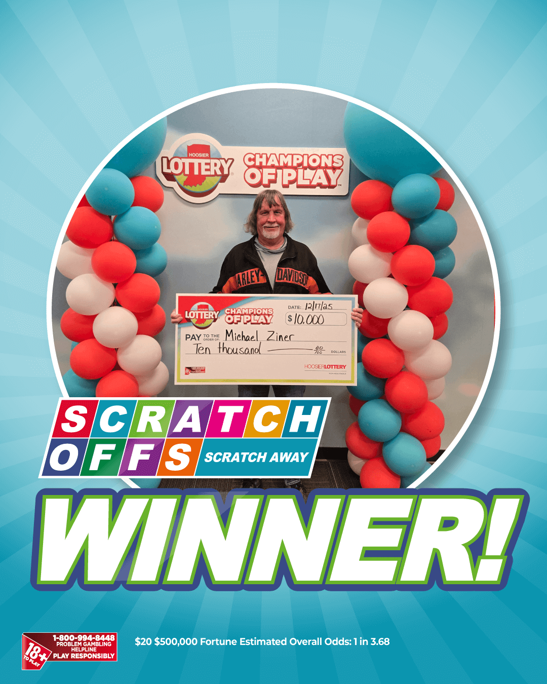 At home, he scratched his ticket. Initially, he thought he’d won $100 and was pleased as he set it aside. Michael always scans his tickets on the Hoosier Lottery app to be sure he didn’t miss anything after scratching them. And sure enough, he didn’t win $100, but rather $10,000!