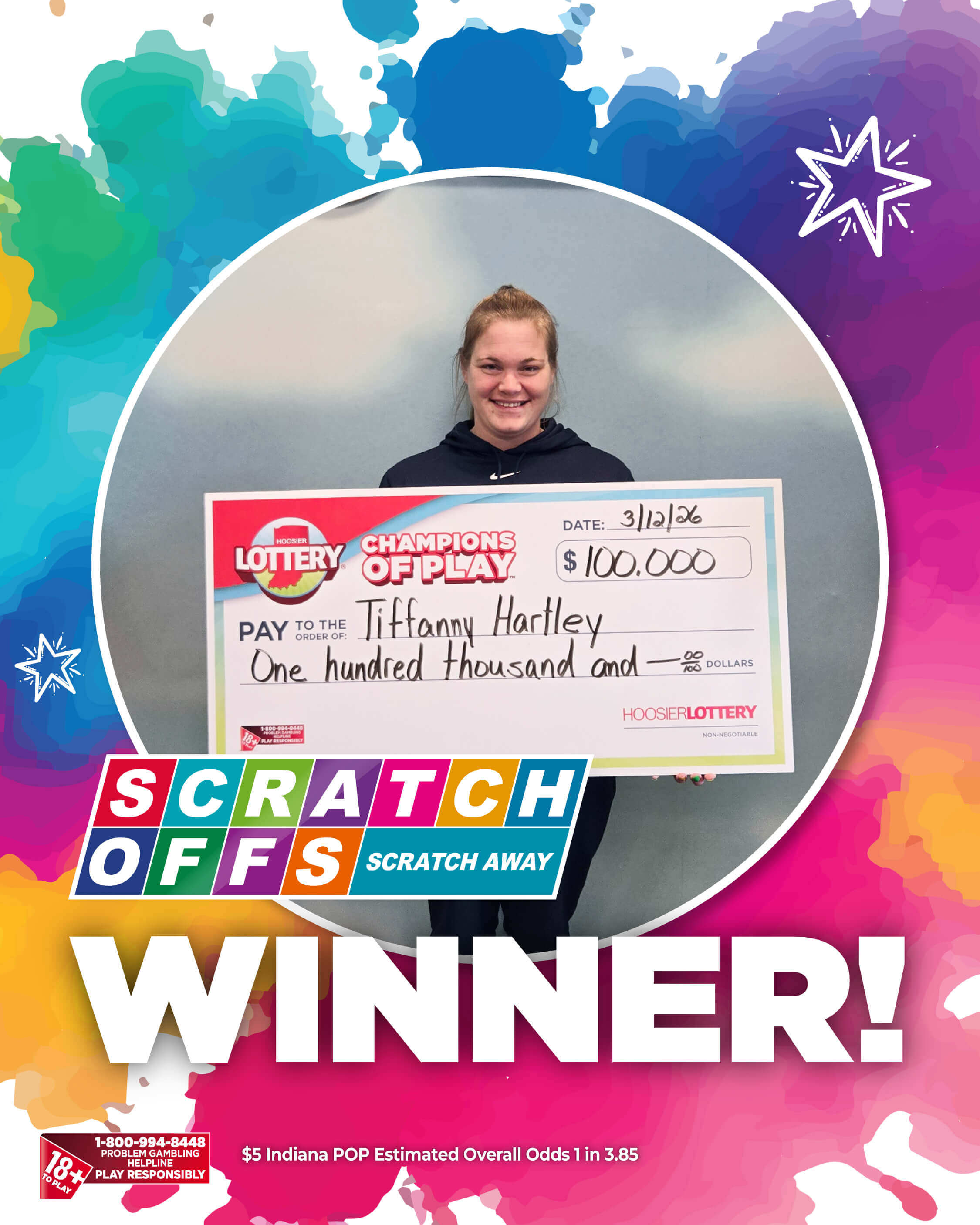 Tiffanny Hartley was on her way home when she stopped for gas. While at the gas station, she purchased a few Hoosier Lottery Scratch-offs and won $20. She then decided to purchase the new $5 Indiana POP Scratch-off because of the colorful design.