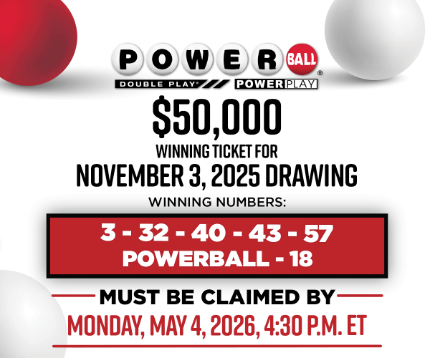 The $50,000 Powerball ticket that matched four white balls and the Powerball was purchased at Casey’s #3987 located at 12011 South U.S. Hwy 421 in Wanatah for the Nov. 3, 2025, drawing.