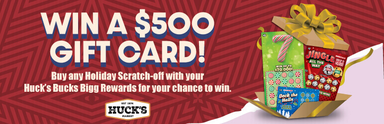 What: Registered Huck's Bigg Rewards members who purchase $5 Holiday 7s, $2 Jingle All the Way, or $1 Deck the Halls Scratch-offs will be entered into a drawing for one of four prizes. Number of entries corresponds to the price point of Scratch-off purchased. Drawing conducted and prizes awarded by Huck's. Self-Service sales excluded. Four prizes awarded across all stores.