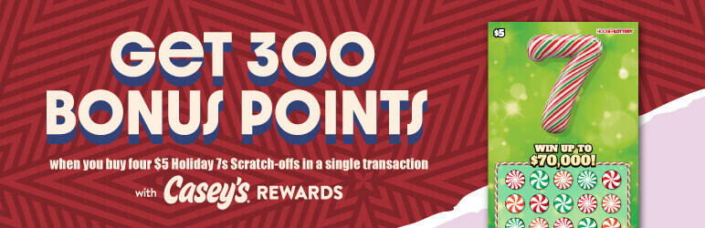 What: Casey's Rewards members that purchase four (4) Holiday 7s Scratch-offs, in a single transaction, with their Casey's Rewards number will earn 300 Casey's Rewards bonus points.