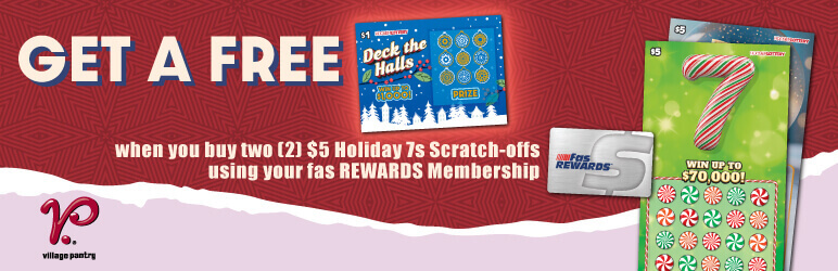 What: fas REWARDS members purchase two $5 Holiday 7s Scratch-offs, in a single transaction, receive a free $1 Deck the Halls Scratch-off. Self-Service sales excluded. While supplies last.