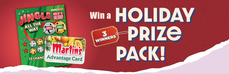 What: Martin's Advantage Card customers who purchase four $2 Jingle All the Way Scratch-offs, in a single transaction, will be entered in a sweepstakes for one of three Holiday prizes. Drawing conducted and prizes awarded by Martin's. Self-Service sales excluded. Three prizes awarded across entries from all stores.