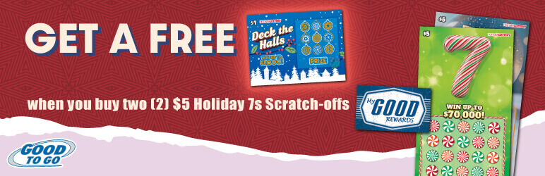 What: My Good Rewards members who purchase two $5 Holiday 7s Scratch-offs, in a single transaction, receive a free $1 Deck the Halls Scratch-off. While supplies last.