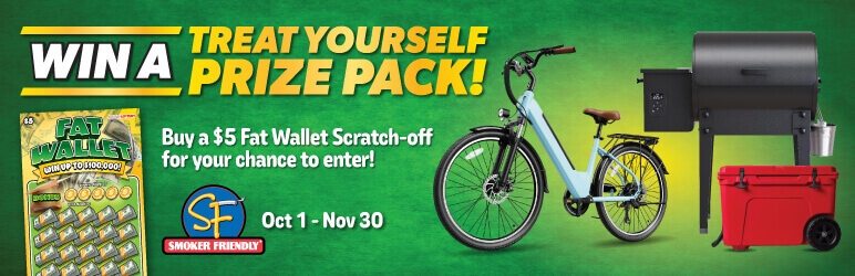 What: Smoker Friendly Smokin' Rewards members who purchase a $5 Fat Wallet Scratch-off will be entered for one of three Gift Yourself prize packs. Self-Service sales excluded. Drawing conducted and prizes awarded by Smoker Friendly. Three prize packs awarded from entries from all stores.